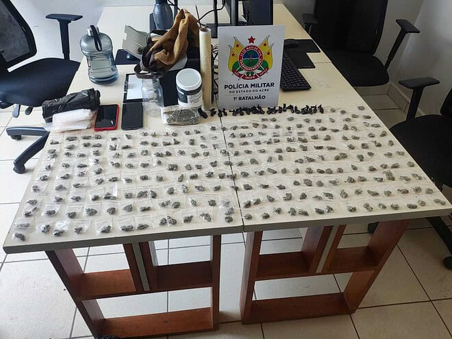 Na manhã desta sexta-feira, 11, uma guarnição do 1° Batalhão de Polícia Militar (1° BPM) apreendeu maconha e cocaína, no bairro Calafate em Rio Branco. Um homem de 42 anos foi preso no local por tráfico de drogas.