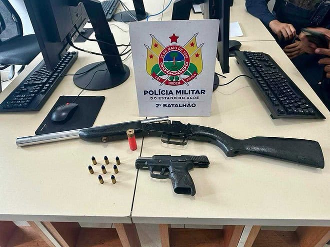 Com ele foi encontrada uma arma de fogo, escopeta calibre 12 e na residência, onde se encontrava mais três pessoas, uma pistola calibre 9 milímetros, com sete munições. Os presos informaram pertencer a uma organização criminosa e usaria os armamentos para confronto com grupo rival.