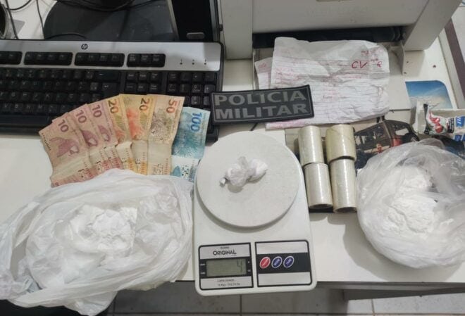 Pela manhã, uma guarnição recebeu denúncia anônima, via Centro de Operações da Polícia Militar (Copom), de que uma mulher de 45 anos, moradora do bairro Senador Pompeu, estaria traficando entorpecentes. No local, os policiais militares identificaram a mulher, que é monitorada da justiça. Autorizada a entrada na casa, foram encontrados dentro de um guarda-roupa dois invólucros de material aparentando ser cocaína, de aproximadamente 4 gramas, dois sacos de barrilha com o peso aproximado de 472 gramas, além de rolos de papel filme cortados, 220 reais em dinheiro e uma lista com vários nomes.
