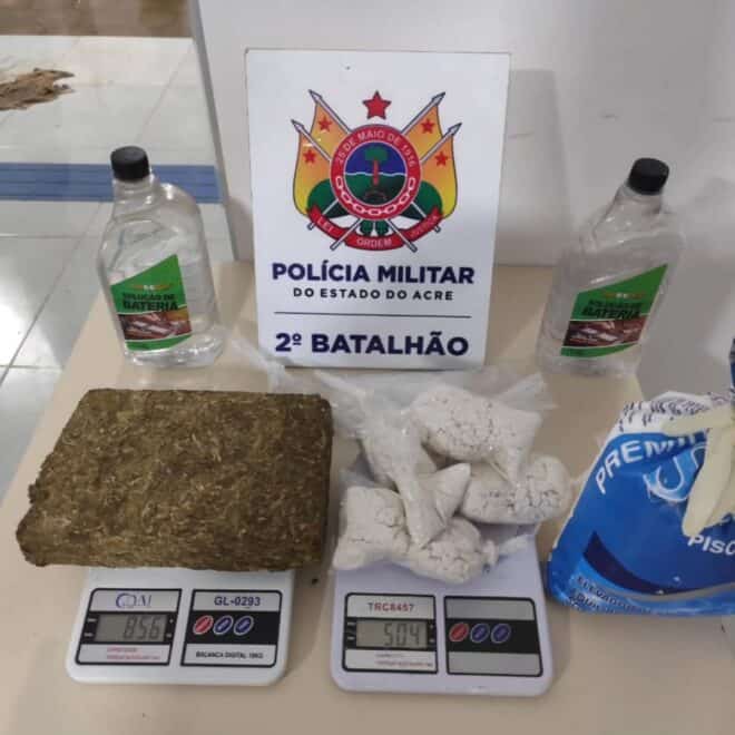 A Polícia Militar do Acre (PMAC) realizou uma apreensão significativa de drogas e materiais usados para o preparo de entorpecentes na noite deste sábado (22), no bairro Taquari, em Rio Branco. A ação foi conduzida pelo grupamento tático do 2° Batalhão de Polícia Militar (2° BPM), durante rondas ostensivas na região.