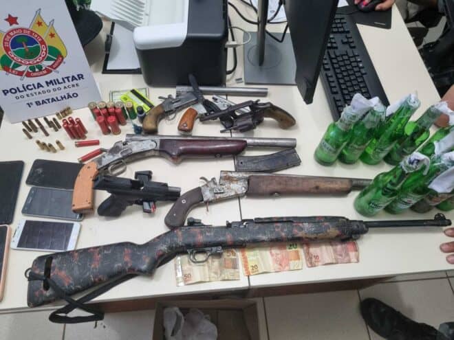 Sete armas de fogo foram apreendidas por militares do 1º Batalhão da Polícia Militar do Acre (1º BPM/PMAC) em uma ocorrência iniciada na tarde desta quarta-feira e finalizada somente à noite, no bairro Carandá, em Rio Branco. Na ação, três homens foram presos e dois menores apreendidos.
