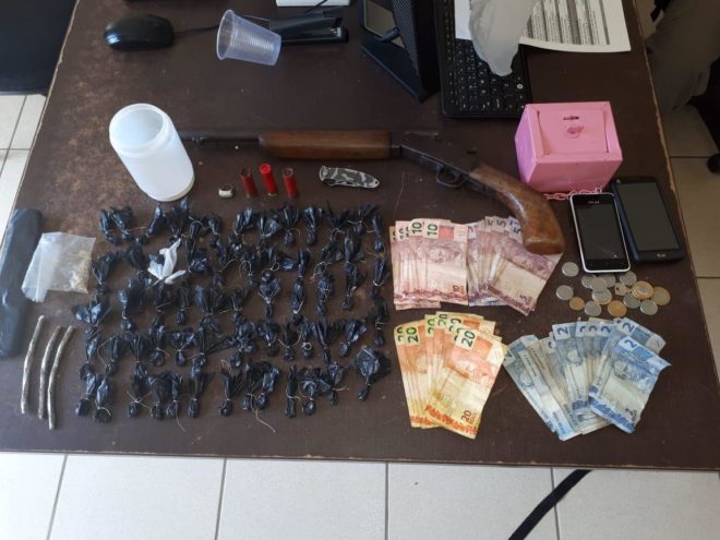 No sábado, 3, policiais militares do 2º Batalhão (2º BPM) prenderam um homem por tráfico de drogas, na travessa Beija Flor, bairro Areal. Na ação foram apreendidos uma escopeta calibre .28, três cartuchos, 60 trouxinhas de cocaína, três tabletes de maconha, além de certa quantia em dinheiro. O envolvido havia saído do presídio Francisco de Oliveira Conde há cerca de três meses.