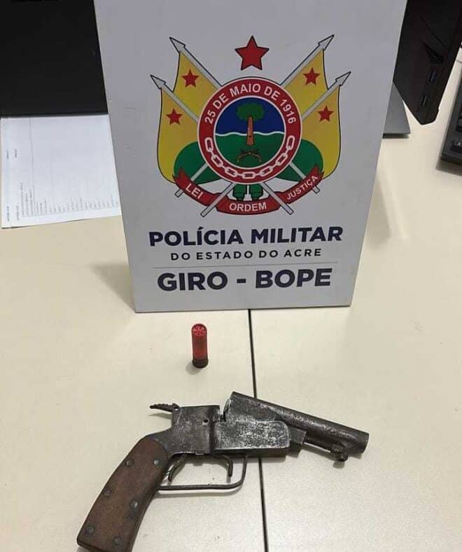 Na tarde desta segunda-feira, 24, uma guarnição da companhia Giro, do Batalhão de Operações Especiais (Bope) da PMAC, prendeu um homem e apreendeu um menor que transitavam na Avenida Durval Camilo, no bairro Canaã, com uma arma de fogo na cintura.