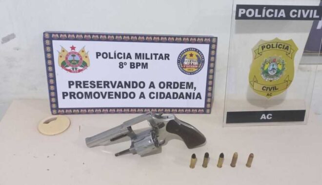 É importante destacar que o autor estava em posse de uma arma de fogo e 05 (cinco) munições, sendo este também suspeito dos delitos de tentativa de homicídio e homicídio ocorridos recentemente em Sena Madureira.