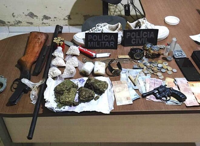 O homem disse ainda que os itens de uso pessoal haviam sido deixados por usuários de drogas, como garantia de pagamento do entorpecente. Outra arma, a espingarda de calibre .28, foi apreendida pela guarnição, na casa de um parente, onde o envolvido informou ter deixado para ser guardada.