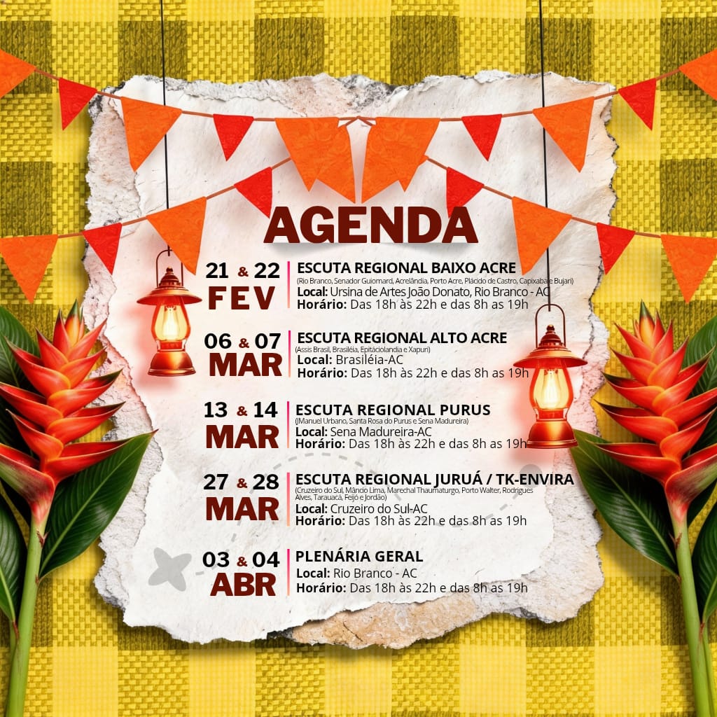A próxima etapa do fórum já tem data marcada. A Escuta Regional do Purus, que reúne representantes de Manoel Urbano, Santa Rosa do Purus e Sena Madureira, será realizada nos dias 13 e 14 de março, em Sena Madureira, com programação das 18h às 22h e das 8h às 19h.