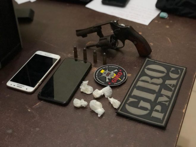 Uma guarnição do Grupo de Intervenção Rápida Ostensiva (GIRO) da Polícia Militar do Acre (PMAC) prendeu dois homens, apreendeu entorpecente e uma arma de fogo na noite deste domingo, 29, no bairro Eldorado.