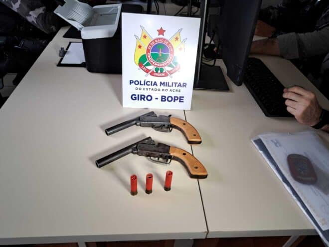 Os militares patrulhavam pelo bairro quando abordaram os dois homens, que transitavam de modo suspeito. A motocicleta tinha restrição de roubo/furto, e cada um dos indivíduos portava uma arma de fogo de fabricação artesanal, além de munições.