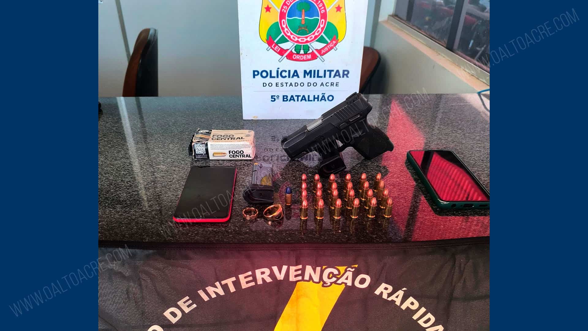 Com ele, os policiais apreenderam uma pistola Taurus calibre 9mm, municiada com 13 munições intactas, além de um carregador sobressalente com mais cinco munições.