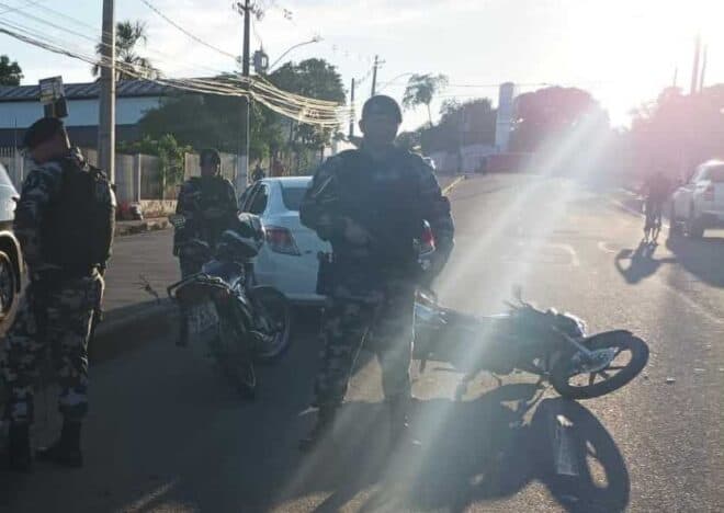 A guarnição realizava o patrulhamento de rotina na região quando se deparou com uma discussão e vias de fato entre dois homens que haviam se envolvido em um acidente de trânsito entre um veículo modelo Prisma e uma motocicleta.