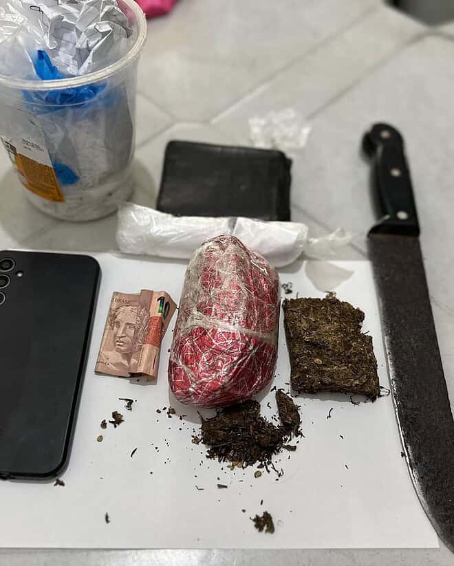 Durante a abordagem, os policiais encontraram na mochila do indivíduo 154 gramas de maconha e sacos plásticos utilizados para embalar e comercializar entorpecentes. Em depoimento preliminar, o jovem confessou ser membro de uma facção criminosa com atuação na cidade.