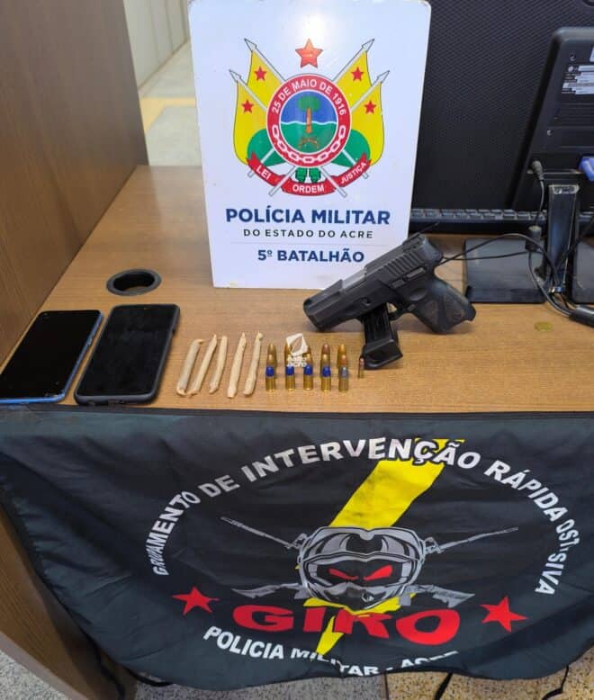 A Polícia Militar do 5º Batalhão, por meio da equipe do GIRO, realizou uma operação bem-sucedida na Vila Nary Bela Flor, distante cerca de 9 km da cidade de Epitaciolândia, que culminou na prisão de dois suspeitos e na apreensão de arma de fogo, munições, drogas e uma motocicleta possivelmente ligada a uma facção criminosa. A ação foi intensificada após denúncias de moradores da comunidade sobre perturbação da ordem pública na região. Um dos detidos estaria envolvido em outra ação recente onde foi preso na companhia da mulher com drogas, arma, munição, dinheiro, entre outros objetos mas, foram liberados a mando do juiz de garantias.
