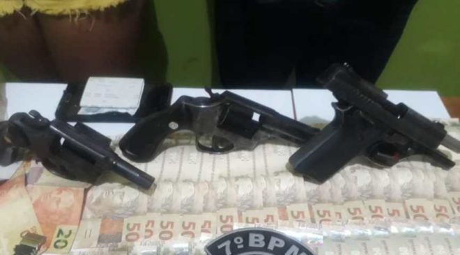 O veículo Pálio de cor prata foi abordado pelos agentes, que pediram para os passageiros e o motorista saírem. Durante a revista, foram encontrados uma pistola, um carregador com 6 munições intactas, 2 revólveres, 12 cartuchos, R$ 2.175 em espécie (divididos em volumes), dois cartões de crédito da Caixa Econômica Federal e 1073 gramas de substância que aparentava ser maconha.