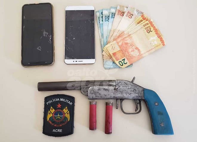 Foi quando revistaram uma bolsa onde localizaram uma arma tipo escopeta calibre 28, munição, quase R$ 700 reais provenientes do comercio de drogas e material usado para embalar entorpecentes. A casa foi alugada para realizar o comercio de drogas.