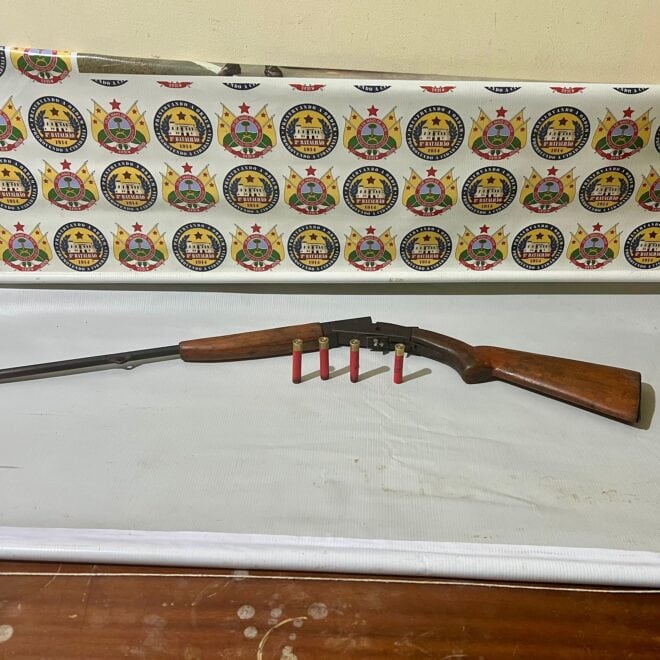 Nas diligências realizadas nas proximidades, os militares localizaram um ponto de apoio aparentemente utilizado pelo suspeito, onde foi encontrada uma espingarda calibre 36 com quatro cartuchos, sendo um intacto e três deflagrados. Devido ao desgaste, marca e numeração da arma estavam ilegíveis, impossibilitando sua identificação imediata.