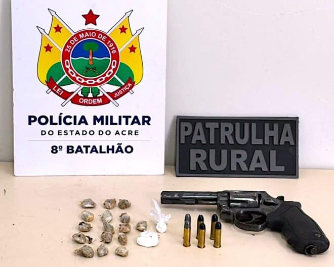 O 8º Batalhão da Polícia Militar do Acre realizou, na manhã desta quinta-feira, 20, uma ação de patrulhamento rural que resultou na apreensão de drogas, munições e um revólver calibre .38 em uma residência localizada no Ramal do 15, zona rural de Sena Madureira. Um homem foi preso e outro conduzido para averiguação.
