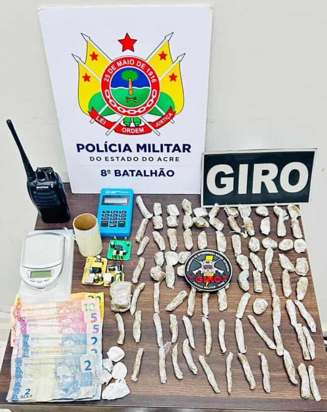 Sena Madureira (AC) – 12 de dezembro de 2025 – A Polícia Militar do Acre (PMAC), por meio do Grupamento de Intervenção Rápida Ostensiva (GIRO) do 8º Batalhão, apreendeu drogas e diversos materiais relacionados ao tráfico durante patrulhamento no bairro Vitória, em Sena Madureira, na noite desta quinta-feira, 11.