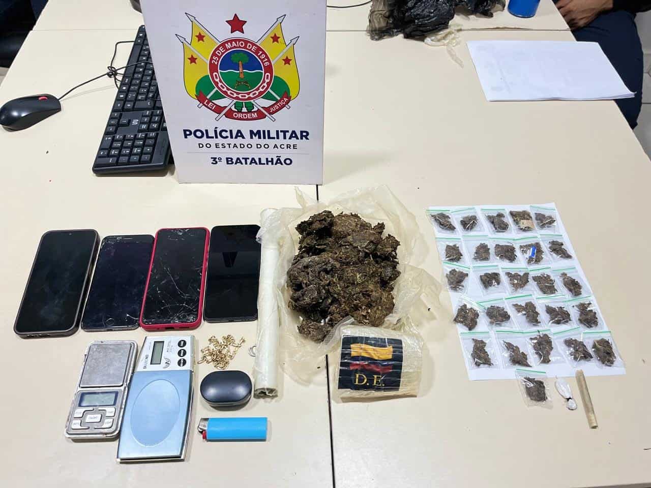 Em patrulhamento no bairro Eldorado, em Rio Branco, uma guarnição do Terceiro Batalhão da Polícia Militar, com apoio da Força Tática e do RPM, apreendeu entorpecentes, celulares e materiais usados no tráfico de drogas na tarde de sexta-feira (21). A ação ocorreu após a corporação receber denúncia anônima informando que dois indivíduos estariam comercializando drogas na região.