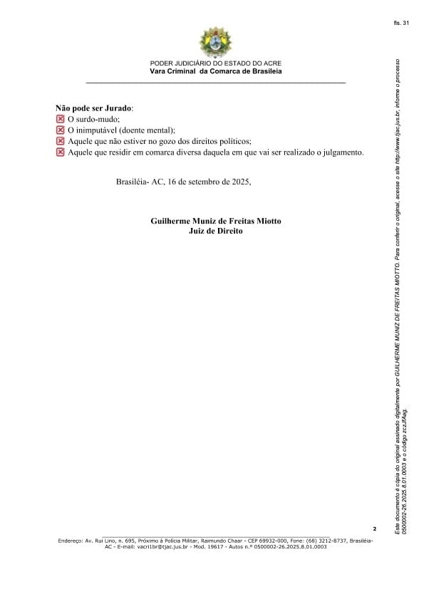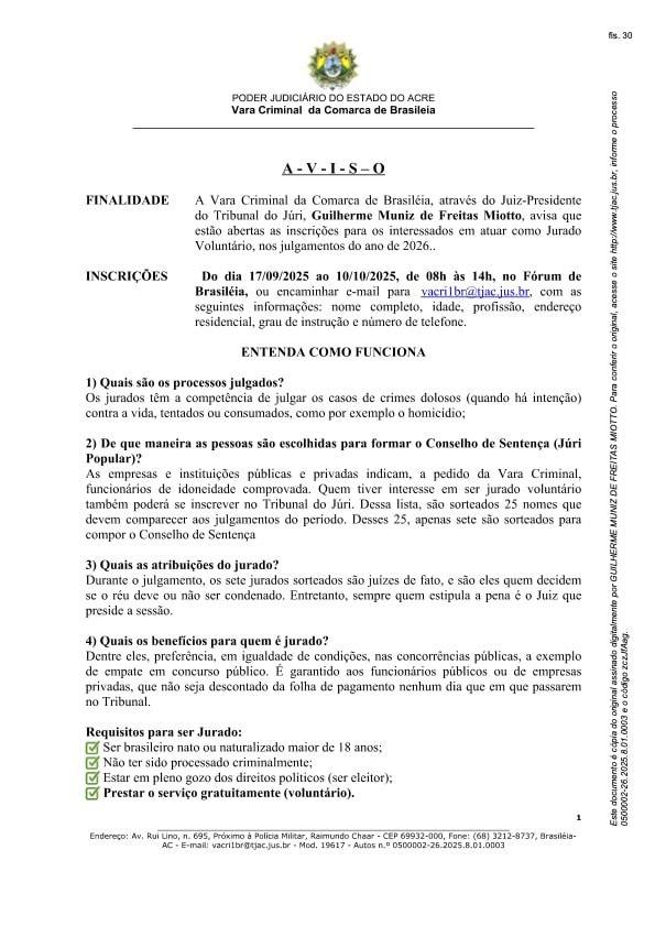 A Vara Criminal da Comarca de Brasileia, sob responsabilidade do juiz-presidente do Tribunal do Júri, Guilherme Muniz de Freitas Miotto, anunciou a abertura das inscrições para cidadãos interessados em atuar como jurados voluntários nos julgamentos do ano de 2026.