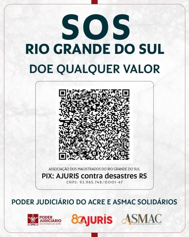 Além dessa medida, quem tiver interesse em ajudar individualmente, a Presidência do TJAC com a Associação dos Magistrados do Acre (ASMAC) e a Associação dos Magistrados do Rio Grande do Sul, destinaram conta PIX que recebe doações em dinheiro pela chave CNPJ: 92.958.800/0001-38, no banco Barisul.