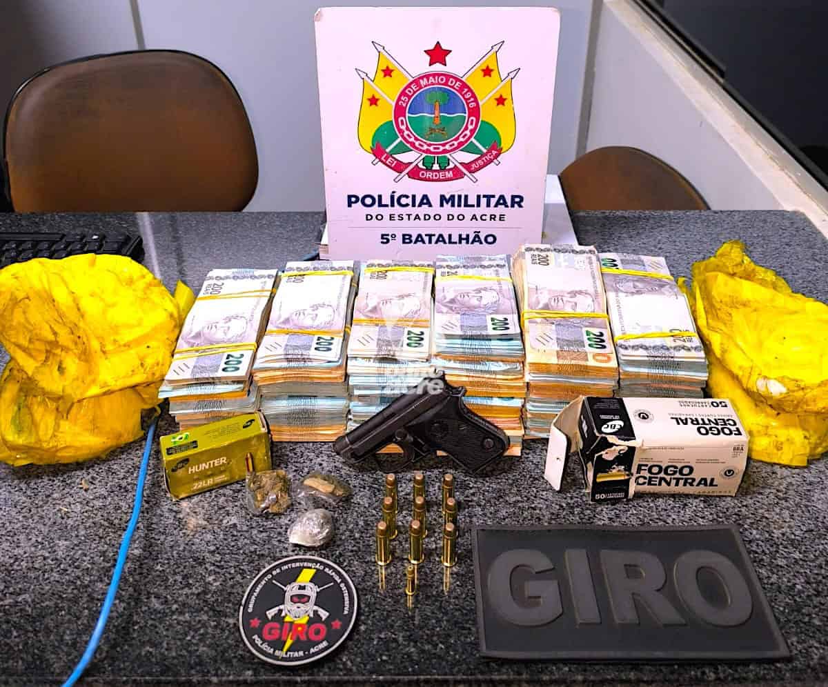 Uma operação policial realizada na madrugada deste sábado (30) resultou na apreensão de R$ 211.950,00 em espécie, drogas e uma arma de fogo em uma residência localizada no Ramal do Polo, município de Brasiléia, interior do Acre.