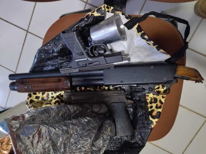 Foram apreendidas três pistolas, uma escopeta e munições, além de um colete balístico, que supostamente foi furtado de um agente da segurança pública.