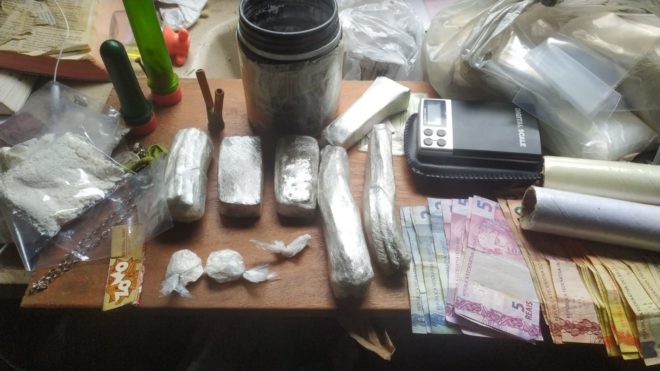No referido endereço, durante o cumprimento dos mandados de busca e apreensão, a Policia Civil encontrou em poder dos investigados, drogas (maconha e cocaína), balança precisão, dinheiro R$ 570,00 (quinhentos e setenta reais) oriundo do tráfico do entorpecente, material para embalagem da droga, carregador de pistola.
