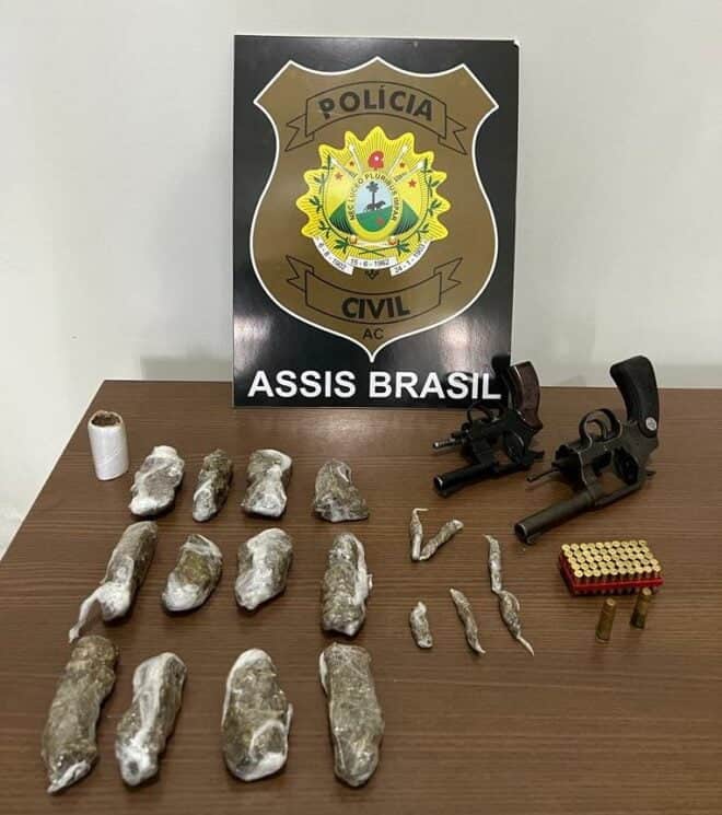 Após a entrada dos policiais ser autorizada pela proprietária, os policiais civis fizeram buscas na residência e encontraram as mochilas que os suspeitos trouxeram, as quais tinham em seu interior diversos invólucros de substância característica de maconha e em outra bolsa dois revólveres, dos calibres .22 e .38. além de munições.