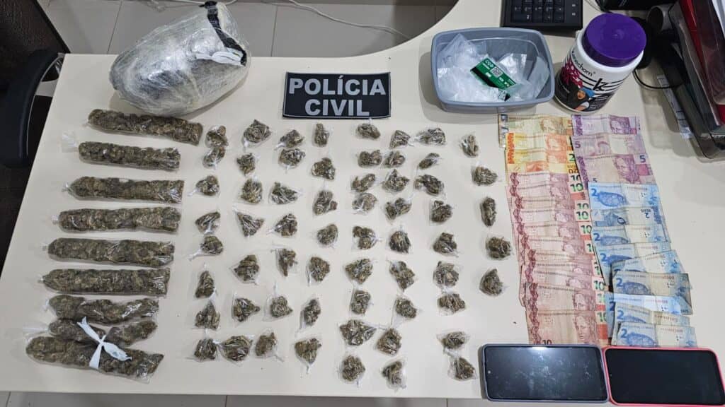 “Durante a busca na residência foram encontrados 70 invólucros da mesma droga já prontos para venda, sendo 61 menores e 9 maiores, escondidos no interior da geladeira. Além disso, os policiais apreenderam R$ 263,00 em dinheiro trocado e sacos plásticos utilizados para embalar os entorpecentes”, informou o delegado, Dr. Marcílio Laurentino.