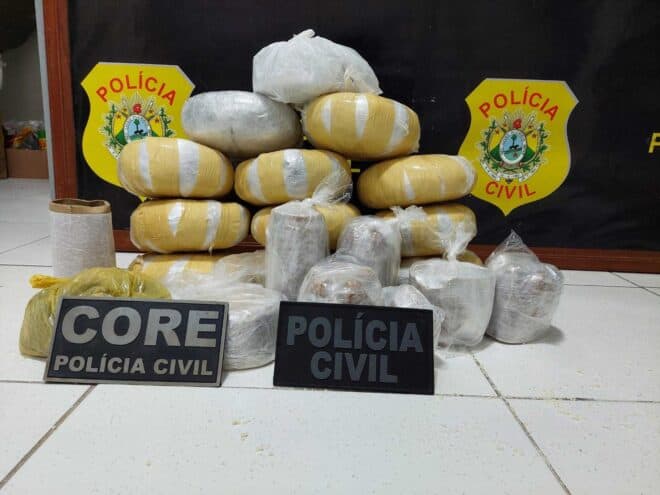 Na tarde desta segunda-feira, 19, a Polícia Civil em Marechal Thaumaturgo durante operação HÓRUS do programa “Guardiões da Fronteira” apreendeu um carregamento de quase 20kg de entorpecentes, 11.705kg de maconha e 7,400kg de oxidado de cocaína, que tinham como destino a capital Rio Branco.