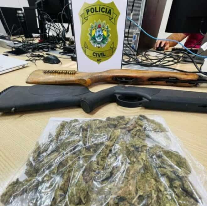 A ação policial ocorreu em uma residência localizada na Rua México, nº 304, no bairro Habitasa, em Rio Branco. Durante o cumprimento dos mandados de prisão e busca e apreensão, dois suspeitos, identificados pelas iniciais W.A.S. e E.C.A., foram presos. Com eles, foram apreendidos 174 gramas de Skank, duas armas de fogo adulteradas para o calibre .22 e 14 munições.