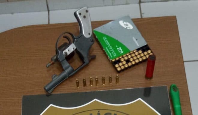 A pessoa alvo do mandado não se encontrava no local, mas na residência os investigadores apreenderam duas armas de fogo, sendo uma espingarda e um revólver, além de munições.