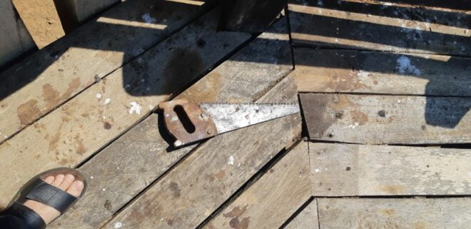 Um serrote que foi usado para cortar partes do animal foi deixado e entregue na delegacia.