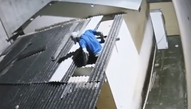 Um sistema de segurança de uma propriedade localizada na cidade de Epitaciolândia, flagrou a ação de um ladrão que subiu e retirou parte do telhado de um comércio, para praticar roubo de alguns produtos.