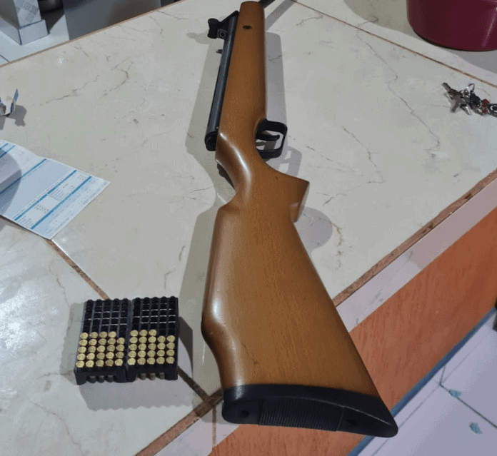 Os agentes cumpriram um mandado de busca e apreensão na residência do investigado, onde encontraram um rifle modificado calibre 22 e várias munições