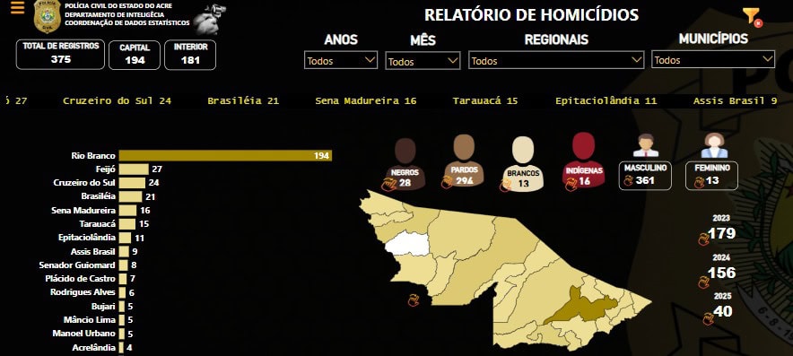Com o objetivo de aprimorar a análise de dados e tornar a tomada de decisões mais eficaz no combate à criminalidade, a Polícia Civil do Acre (PCAC) desenvolveu uma série de dashboards interativos utilizando a plataforma Power BI, uma ferramenta que transforma dados em gráficos e visualizações dinâmicas e acessíveis. Os painéis apresentam informações atualizadas sobre mortes violentas no estado e permitem o cruzamento de dados por município, tipo de crime, período, sexo da vítima, entre outros indicadores.