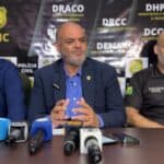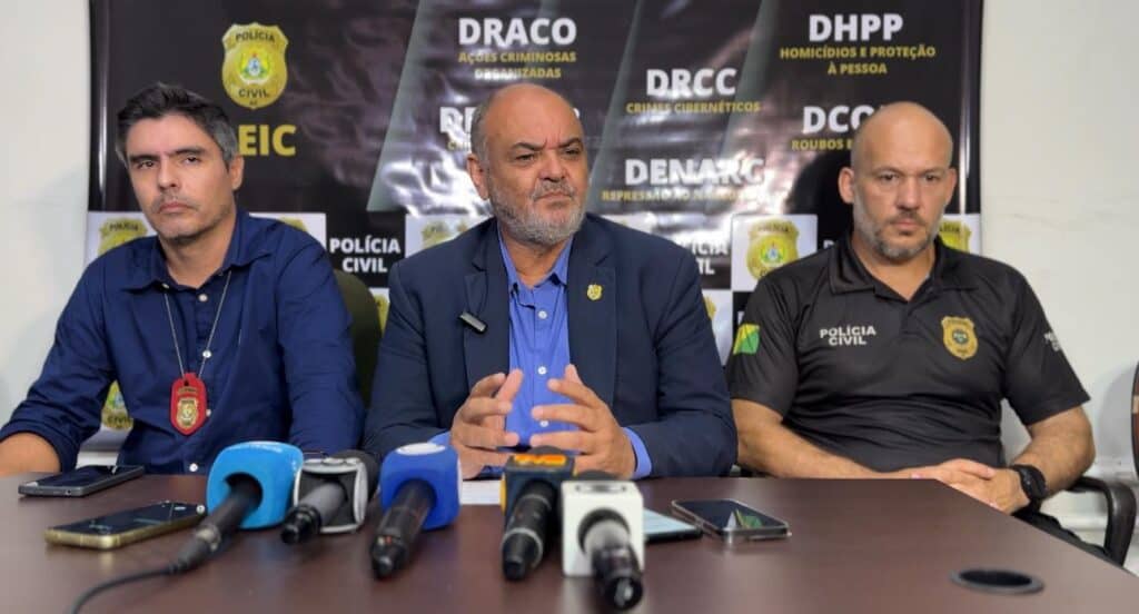 - Em coletiva de imprensa, o delegado-geral Henrique Maciel, acompanhado dos delegados Pedro Paulo Buzolin e Leonardo Ribeiro, destacou o empenho da Polícia Civil na elucidação do crime e na busca pela criança desaparecida. Foto: assessoria/ PCAC.