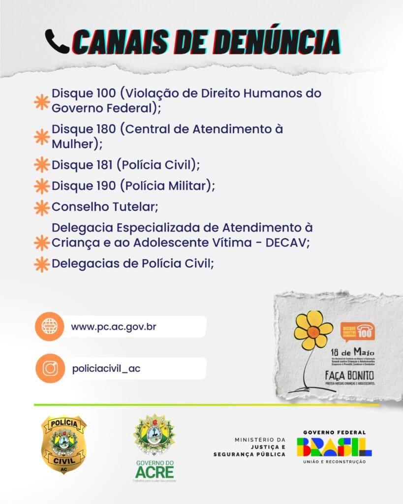 A Polícia Civil orienta que qualquer suspeita de abuso ou exploração sexual de crianças e adolescentes seja denunciada por meio dos canais oficiais, como o Disque 100, o 181 ou diretamente nas delegacias.
