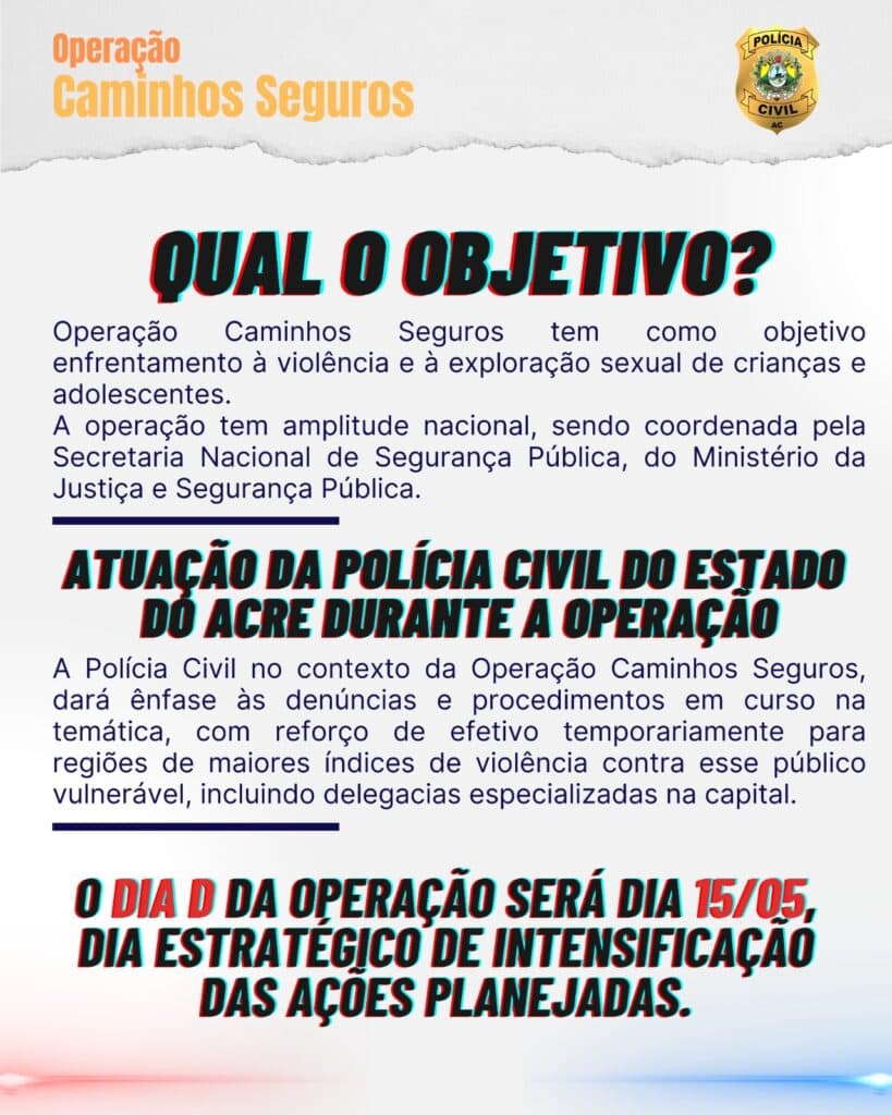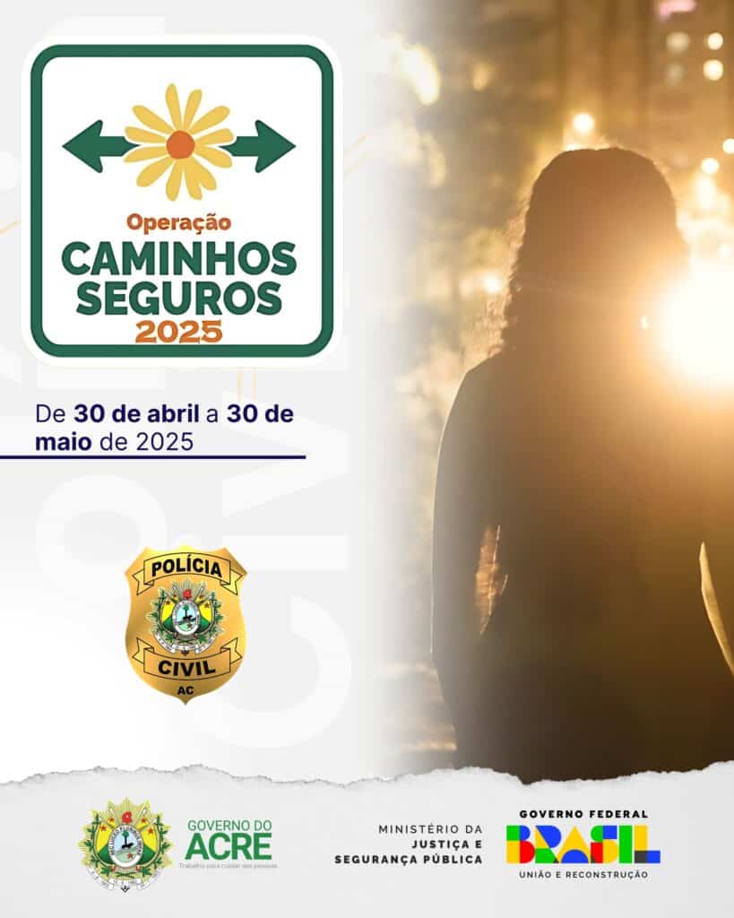 A Polícia Civil do Acre (PCAC) deu início nesta quarta-feira, 30, à “Operação Caminhos Seguros 2025”, uma mobilização nacional que tem como objetivo o enfrentamento à exploração sexual de crianças e adolescentes. A ofensiva, coordenada em âmbito nacional, ocorre entre os dias 30 de abril e 30 de maio, com foco em ações preventivas, educativas e repressivas.