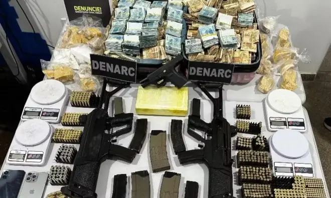 Durante a operação, os policiais localizaram o dinheiro escondido dentro de uma mala. Além disso, foram encontrados armamentos de uso restrito, incluindo dois fuzis calibre .30 de origem israelense e uma pistola Glock calibre 9mm.