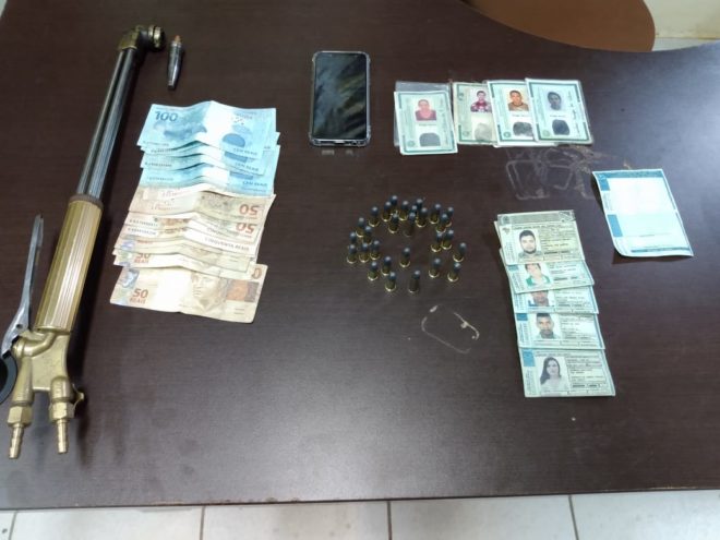 De acordo com os agentes, eles cumpriam mandado de busca e apreensão em uma residência localizada no Bairro João Eduardo I, quando encontraram em posse de Richarles, dois documentos de identidade (RG), seis carteiras habilitação (CNH), um celular, vinte e oito munições, R$ 1.450,00 e uma lança de maçarico de corte (material usado em roubos a caixas eletrônicos).