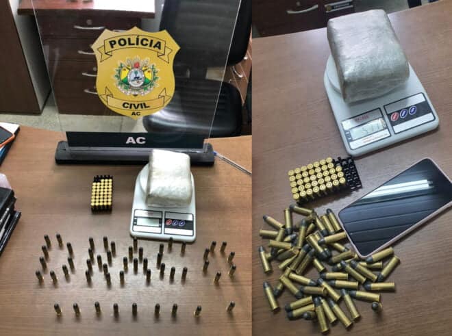 Ao final da tarde desta sexta-feira, 5, a Polícia Civil em Cruzeiro do Sul, por meio do Núcleo DRACO/DENARC prendeu, em flagrante, C. P. F. de 23 anos e sua namorada Q. de S. D. de 18 anos, em posse de 517gm de maconha, 50 cápsulas de munição , não deflagrada, calibre 38’ e 38 cápsulas de munição, não deflagradas, calibre 9mm.