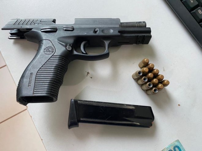 Com o criminoso estava uma pistola 840 da marca Taurus e 13 munições .40, além da quantia de R$ 490,00, que seria produto do crime.