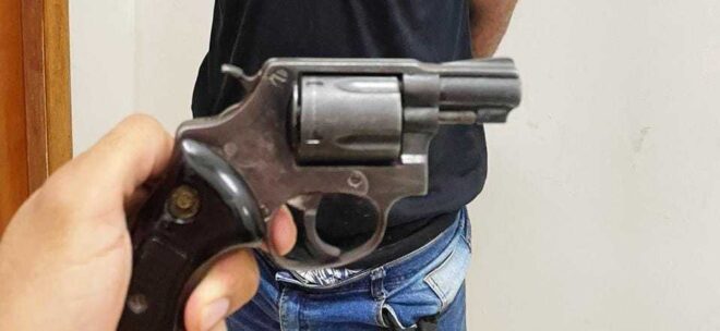 A arma, um revólver calibre 38′, estava municiada na cintura do investigado durante abordagem policial.