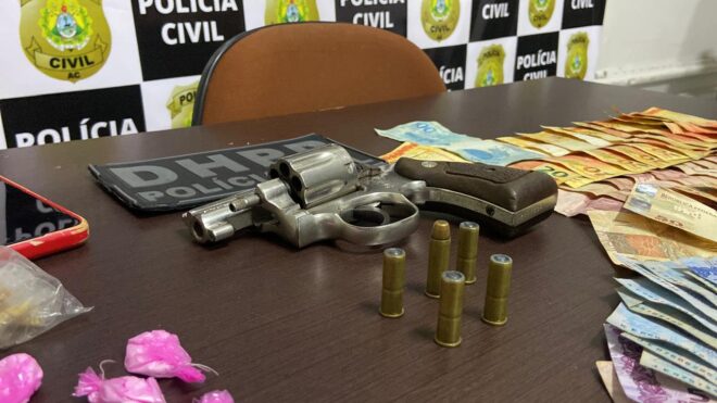 Durante a busca na residência do suspeito, os investigadores apreenderam um revólver calibre .38 municiado, uma significante quantia em dinheiro e diversas porções de drogas prontas para comercialização. O material foi encaminhado para perícia técnica.