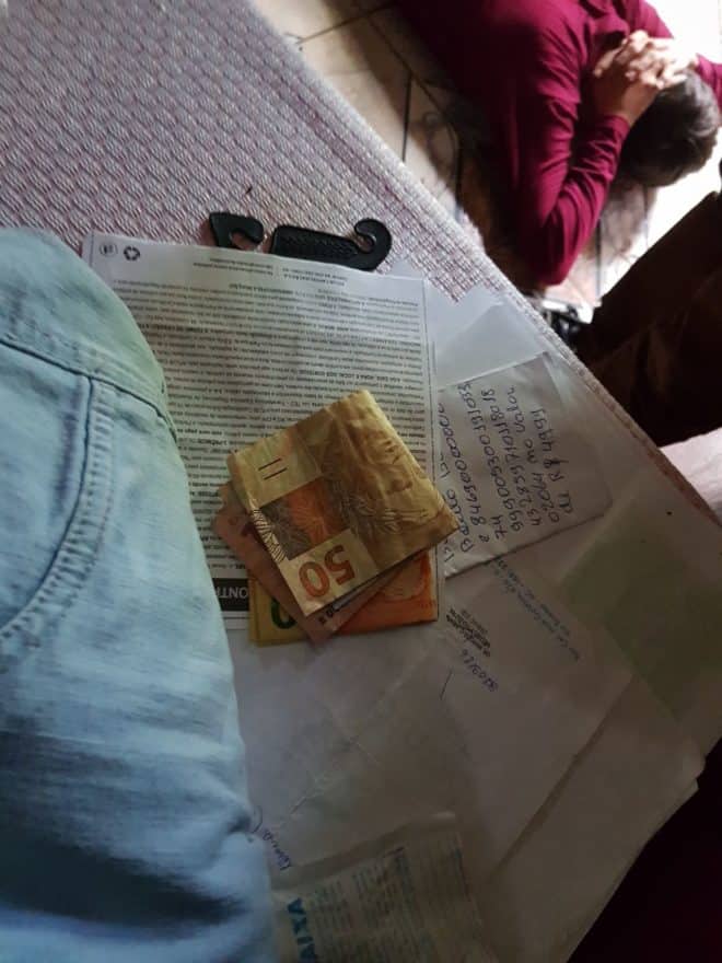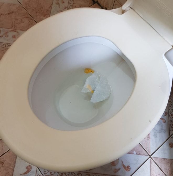 Durante as buscas na casa, se pode ver que ainda foi tentado apagar as provas do crime. Algumas ‘trouxinhas’ foram encontradas dentro do vaso sanitário (latrina). Também foi localizado material usado para embalar a droga antes de ser comercializada.