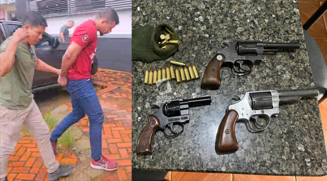 Após a detenção, o investigado foi conduzido até a residência, onde foi cumprido o mandado de busca e apreensão. No local, os policiais encontraram um verdadeiro arsenal ilegal, composto por duas armas de fogo calibre .38, um revólver adaptado para munição calibre .22 — contendo uma munição intacta e outra deflagrada — além de 48 munições calibre .38 intactas, que estavam escondidas dentro de uma meia.