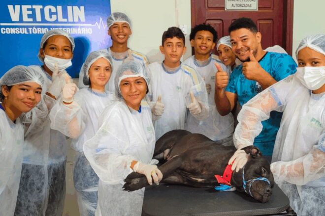 Alunos do curso técnico em veterinária de Plácido de Castro durante aula prática em clínica veterinária parceira. Foto: Ascom/Ieptec