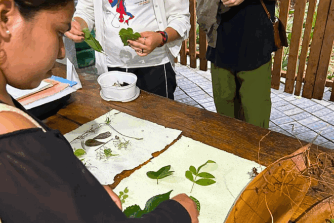 Prestigiando a arte e cultura, o Ieptec oferta cursos livres na Usina de Arte, com 170 vagas abertas para a população de Rio Branco, em 2025. Na foto, alunos praticando a arte da antotipia e fitotipia durante curso livre. Foto: Cedida.