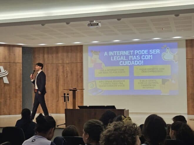 Durante os turnos da manhã e da tarde, foram abordaram temas como os perigos das redes sociais, proteção de dados pessoais e a necessidade de acesso supervisionado por um adulto responsável. Para tornar o momento mais dinâmico e atrativo, a equipe realizou um jogo interativo de perguntas e respostas, que despertou grande interesse e participação dos alunos.